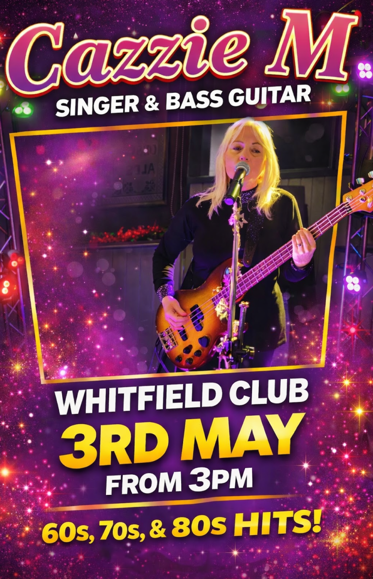 We’re excited to welcome Cazzie M to the Whitfield Club for the very first time, so let’s give her the warm welcome she deserves. With just her incredible voice and bass guitar, she’ll be performing a fantastic mix of hits from the 60s, 70s and 80s, the perfect soundtrack to your Bank Holiday.